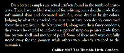 Among others, claiming that the ancient Egyptian pharaohs used papyrus condoms to protect themselves from disease, and arguing that the Egyptians probably did not consider these to be contraceptive devices. All I can say is Collier clearly has never dealt with wrapping papyrus sheets around an unusual shape.